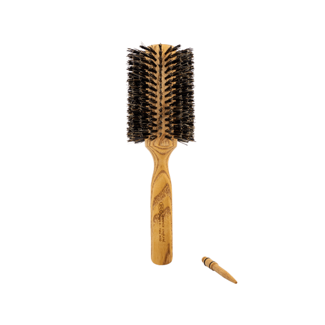 Beech wooden handle covered with varnish and section divider with retractable hair sectioning pick with reinforced bristles.