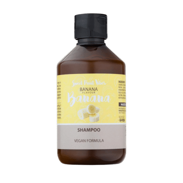Sweet Fruit Vibes Shampoo. Nourishing and moisturizing, it deeply cleanses all hair types. Intense Banana flavour. Its delicate formula makes it ideal for daily cleansing. Gives softness and shine to the hair.